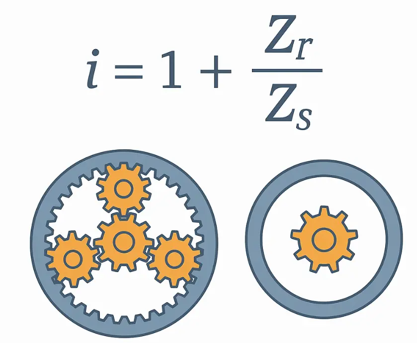 एक साधारण उदाहरण को लागी: यदि सूर्य गियर मा दाँत को संख्या 20 छ र भित्री रिंग मा दाँत को संख्या 60 छ, तब प्रसारण अनुपात हो: